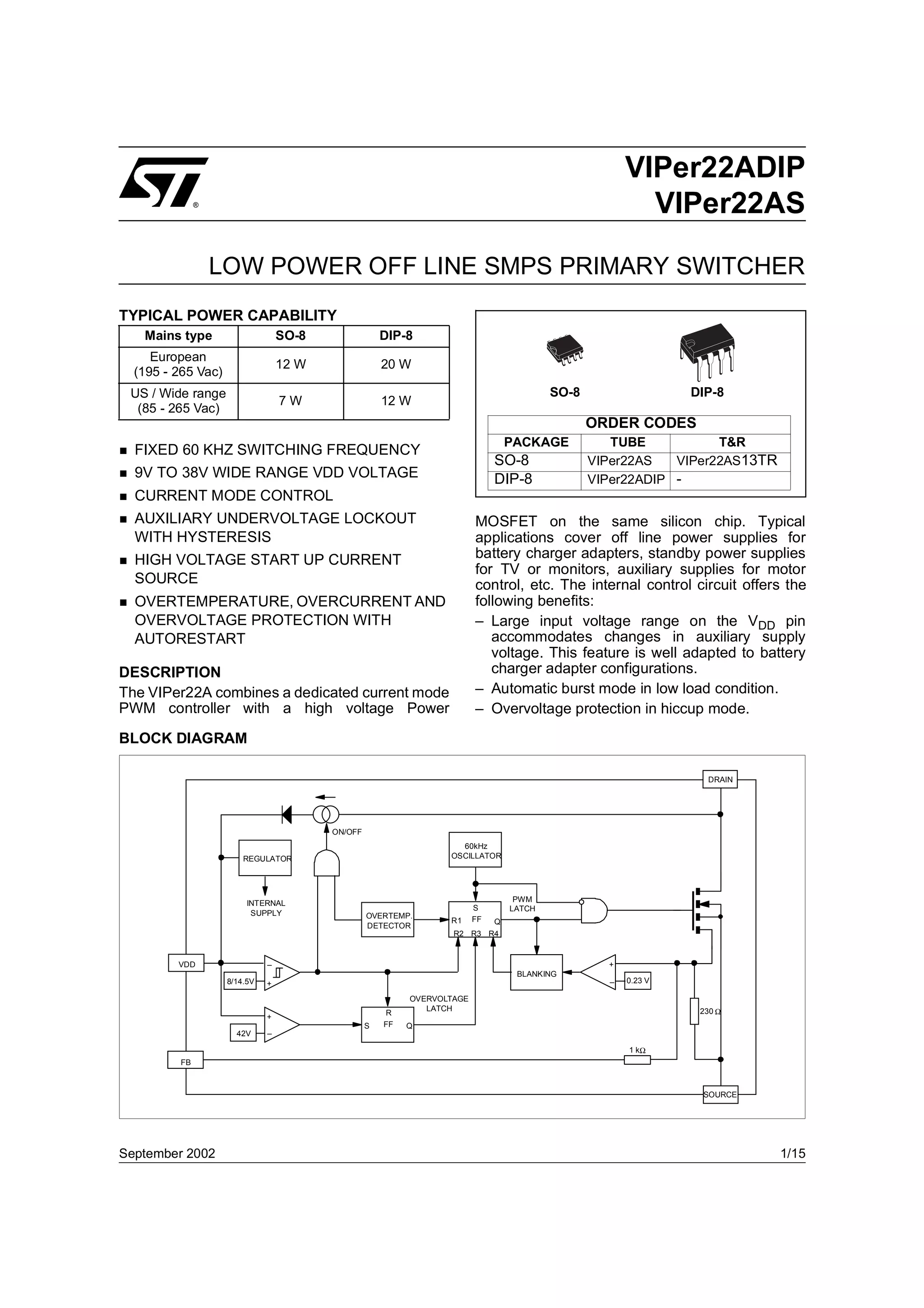 1. The document describes the VIPer22A, a low power offline SMPS primary switcher integrated circuit that combines a current mode PWM controller with a high voltage power MOSFET.