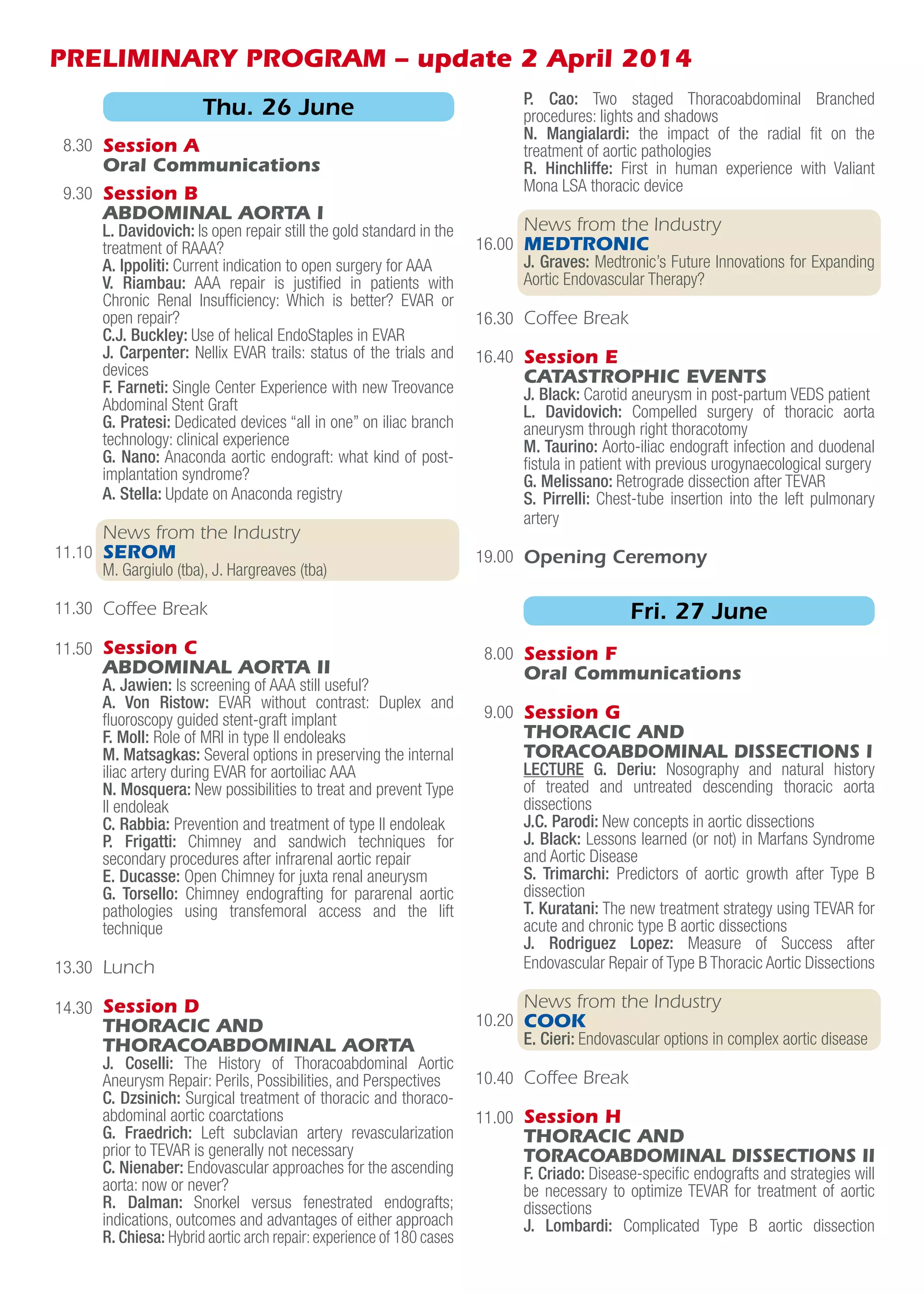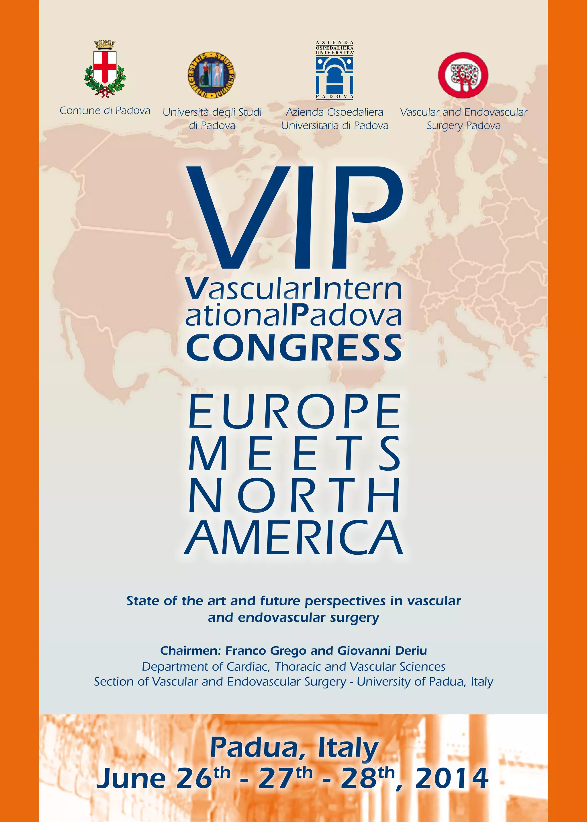 This document provides the preliminary program for the EUROPE MEETS NORTH AMERICA Vascular and Endovascular Surgery Congress taking place June 26-28, 2014 in Padua, Italy. The congress will feature oral presentations and sessions covering topics in vascular, endovascular, and hybrid procedures including abdominal aortic aneurysms, thoracic and thoracoabdominal aortic diseases, peripheral arterial disease, and critical limb ischemia. Presentations will provide state-of-the-art information and future perspectives on vascular and endovascular surgical techniques and management of various vascular conditions. Industry representatives will also give updates on new technologies. The congress is organized by the Department of Cardiac, Thoracic and Vascular Sciences