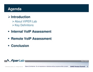 The document discusses penetration testing of VoIP networks. It describes a VoIP security research lab that investigates attack vectors against VoIP systems. When conducting internal VoIP assessments, the objectives are to understand the call requirements, VLAN configuration, and gain access to the voice VLAN to test for vulnerabilities. Sniffing tools can reveal the voice VLAN ID and credentials. VLAN hopping poses a risk if an attacker can access the voice VLAN from their PC. A case study found an attacker was able to hop VLANs in a hotel network and potentially monitor other guests' phone calls due to poor network segmentation. Proper firewalling of voice networks and limiting remote access to voice VLANs are important lessons learned.