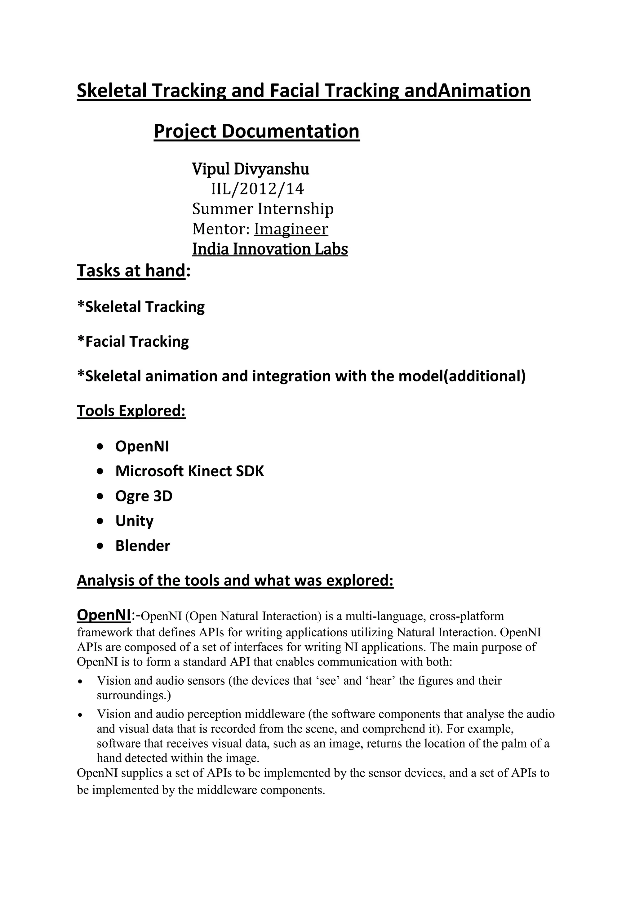 Vipul Divyanshu completed an internship exploring tools for skeletal tracking, facial tracking, and animation using the Microsoft Kinect. He analyzed OpenNI, Microsoft Kinect SDK, Ogre 3D, Unity, and Blender. He found Kinect SDK easiest for full-body skeletal tracking in C#. He tracked a skeleton and animated a 3D character model. For facial tracking, Kinect SDK detected features but could not determine if eyes were open. Ogre showed potential for facial animation but required more study. Overall, the internship provided experience with sensor APIs, skeletal data extraction, and character animation.