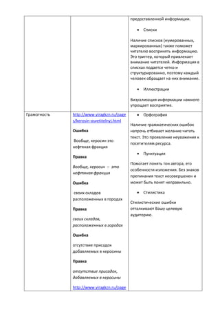 Документ обсуждает важность качественного контента на сайте для успешного продвижения и привлечения аудитории, подчеркивая необходимость структурированности текста, грамотности и использования триггеров для побуждения к покупке. Указывается на недостаток коммерческого текста и отсутствие поисковой оптимизации, что может негативно сказаться на показателях сайта в поисковых системах. Рекомендуется обратить внимание на подбор ключевых слов, наличие уникальных заголовков и правильное оформление текстов с использованием HTML-тегов.