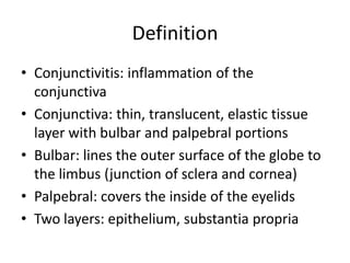 The document provides a detailed overview of conjunctivitis, including its definitions, classifications, and causes, with a focus on viral and bacterial forms. It describes the clinical presentations, symptoms, and treatments for various types of conjunctivitis such as acute serous, hemorrhagic, and follicular conjunctivitis, as well as bacterial forms like mucopurulent and purulent conjunctivitis. Additionally, it covers specific cases such as ophthalmia neonatorum and highlights the importance of prophylaxis and treatment strategies to prevent secondary infections.