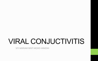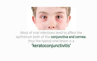 Viral conjunctivitis is caused by various viruses that infect the conjunctiva. The most common types are adenoviral conjunctivitis, caused mainly by adenovirus types 8 and 19, and herpes simplex conjunctivitis caused by HSV-1. Adenoviral conjunctivitis presents with redness, watering, follicles and can cause punctate keratitis if the cornea is involved. Treatment focuses on supportive care and antibiotics to prevent secondary infections. Acute hemorrhagic conjunctivitis is caused by enterovirus 70 and presents with redness, watering, hemorrhages and follicles. Ophthalmia neonatorum can be caused by gon