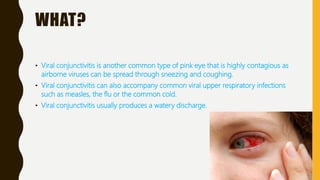 Viral conjunctivitis is a common form of pink eye that is highly contagious and spread through sneezing, coughing, or contact with infected individuals or surfaces. It causes watery discharge from the eye, redness, burning, and light sensitivity. While self-limiting, it can be treated with cool compresses, artificial tears, and antihistamines to relieve symptoms until it runs its course. Proper hand washing and avoiding sharing towels or touching the eyes can help prevent spreading the infection.