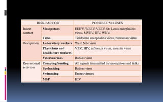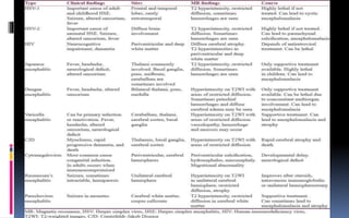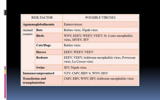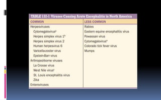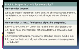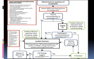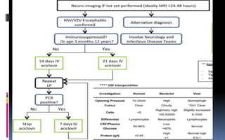 This document provides an overview of acute viral encephalitis. It defines encephalitis and meningoencephalitis, and discusses the causes, pathogenesis, clinical manifestations, diagnosis and management of viral encephalitis. The most common causes are viruses like herpes simplex virus, varicella zoster virus, enteroviruses, and arboviruses. Diagnosis involves CSF analysis, imaging, and PCR. Management involves supportive care, antiviral drugs like acyclovir, and controlling raised intracranial pressure. Prognosis depends on factors like age, severity of symptoms, and time to treatment initiation. Rehabilitation is often needed due to potential neurological sequelae. Early diagnosis and treatment are emphasized to