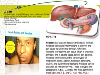 Hepatitis is an inflammation of the liver that is usually caused by a viral infection. There are 5 main types of viral hepatitis: A, B, C, D, and E. Hepatitis A and E are typically transmitted through ingestion of contaminated food or water. Hepatitis B, C and D can be transmitted through contact with infected blood or bodily fluids. While hepatitis A only causes a short-term illness, hepatitis B and C can develop into chronic conditions that lead to serious liver problems like cirrhosis and cancer. Laboratory tests are used to diagnose hepatitis and detect the specific virus, and nursing care focuses on rest, diet, medication management, and health education to prevent transmission and complications.