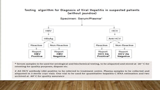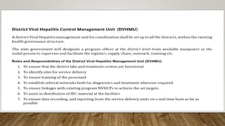 The document outlines the National Viral Hepatitis Control Program (NVHCP) in India. The objectives of the NVHCP are to [1] enhance awareness of hepatitis, [2] provide early diagnosis and management of viral hepatitis at all healthcare levels, and [3] strengthen infrastructure and human resources for comprehensive hepatitis services. The program will implement strategies like immunization, harm reduction, and infection control to prevent hepatitis and establish treatment centers to diagnose and treat hepatitis cases.