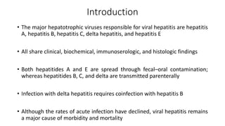 The document provides an overview of viral hepatitis, focusing on hepatitis A (HAV) and hepatitis B (HBV). It discusses their transmission routes, epidemiology, clinical manifestations, diagnosis, and treatment strategies, including vaccine options for prevention. The document details the pathophysiology of each virus, highlighting concerns related to chronic infections and complications such as liver disease and hepatocellular carcinoma.