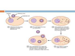 Viral replication occurs in six sequential phases: (1) attachment to host cell receptors, (2) penetration via endocytosis or membrane fusion, (3) uncoating of the viral capsid and release of genetic material, (4) biosynthesis of viral mRNA, proteins, and new genomes using host cell machinery, (5) assembly of new virus particles, and (6) release through cell lysis or budding. The host cell provides energy and materials for the virus to replicate its proteins and nucleic acids.