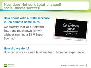 This document outlines a strategy for a video marketing campaign on social media. It recommends setting objectives and identifying the target audience. It then provides tips for public relations, uploading to YouTube, sharing on Facebook and Twitter, paid advertising, outreach, email marketing, making it easy to share, and preparing for potential issues. The strategy was used for a Go Granny parody video by Network Solutions around the 2011 Super Bowl, which received over 60,000 YouTube views and millions of social media impressions within a week.