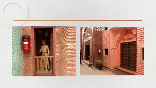 The document provides a layout and descriptions for Virasat 'E' Haveli, a theme-based resort in Amritsar. It lists and describes over 30 areas, displays, and features of the resort including two parking areas, outdoor dining areas, shops, washrooms, a restaurant, reception area, children's activity area, displays of vintage houses, streets, and shops, photo frames, flooring, a model of a vintage Punjab village, and systems for rainwater drainage, sewage, sanitation, and firefighting. The resort is designed to immerse visitors in the culture and architecture of vintage Punjab.