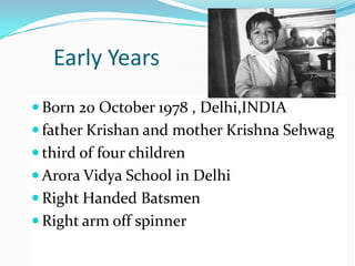 Virender Sehwag was born in 1978 in Delhi, India. He had an early interest and talent in cricket, playing for his school, zone, and under-19 teams. Sehwag made his ODI debut for India in 1999, where he scored his first century off just 69 balls. In tests, he made his debut in 2001 against South Africa, where he scored a century. Sehwag holds records for the fastest 200, 250, and 300 runs in tests. He was awarded the Arjuna Award in 2002 and Padma Shri in 2010 for his cricket achievements and records.