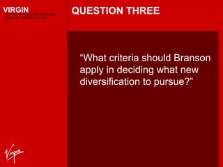 - The diversification should create opportunities for synergies across Virgin's existing operations through shared resources and capabilities.