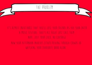 Virgin Mobile introduces a Friend Finder app to help friends stay connected at music festivals where cell reception is typically poor. The app uses Indoor Positioning System (IPS) technology and Virgin Mobile vans set up around the festival grounds to simulate a map and pinpoint friends' locations. This ensures festival attendees can find their friends and enjoy the experience together instead of getting separated or watching performances alone due to lack of coverage.