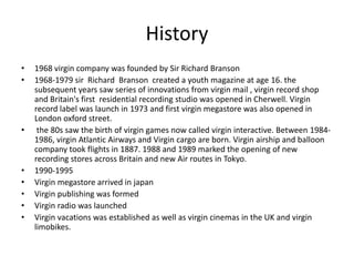 - Sir Richard Branson founded Virgin Group in 1968 as a youth magazine. Over the following decades he expanded into music, airlines, publishing, radio, vacations and more.