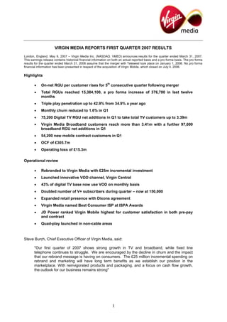 Virgin Media reported its first quarter 2007 results. Key highlights included an increase in on-net RGUs per customer for the fifth consecutive quarter following the Telewest merger, and total RGUs reaching 15.38 million. Triple play penetration increased to 42.9% from 34.9% a year ago. The company saw net additions in digital TV, broadband, and mobile customers. However, fixed line telephone customers continued to decline. While revenue declined slightly from the previous quarter due to lower content revenue, revenue was up £410.5 million year-over-year due to acquisitions.