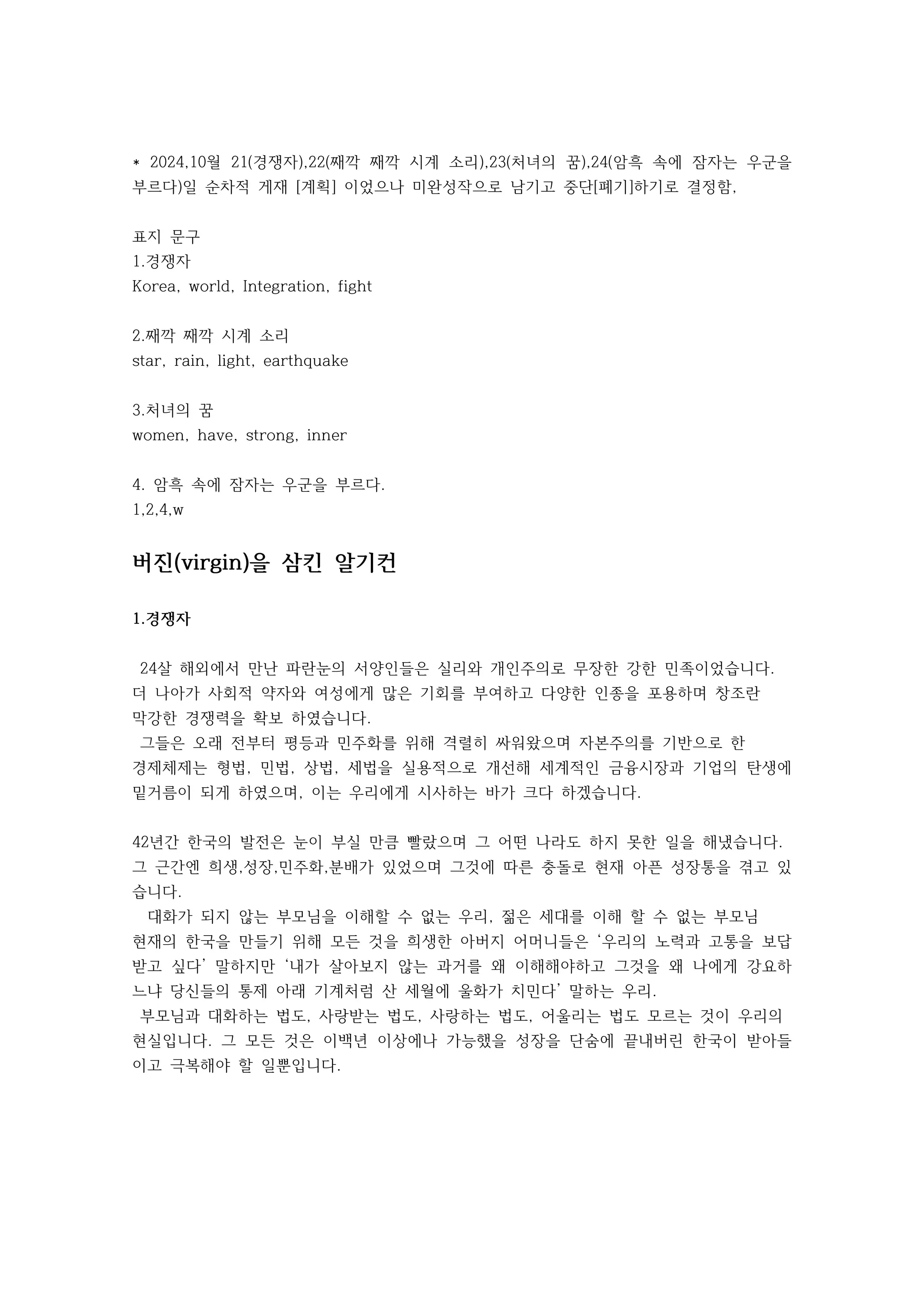 * 2024,10월 21(경쟁자),22(째깍째깍 시계 소리),23(처녀의 꿈),24(암흑 속에 잠자는 우군을