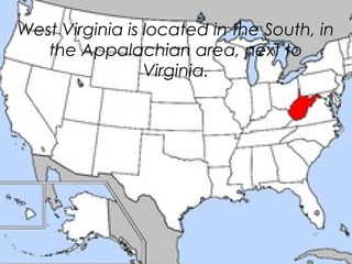 West Virginia is located in the Appalachian Mountains in the South, bordering Virginia. It split from Virginia during the Civil War in 1862 and joined the Union in 1863. West Virginia has a mountainous terrain throughout and a climate that ranges from subtropical in the southwest to continental elsewhere, with hot summers and cold winters.