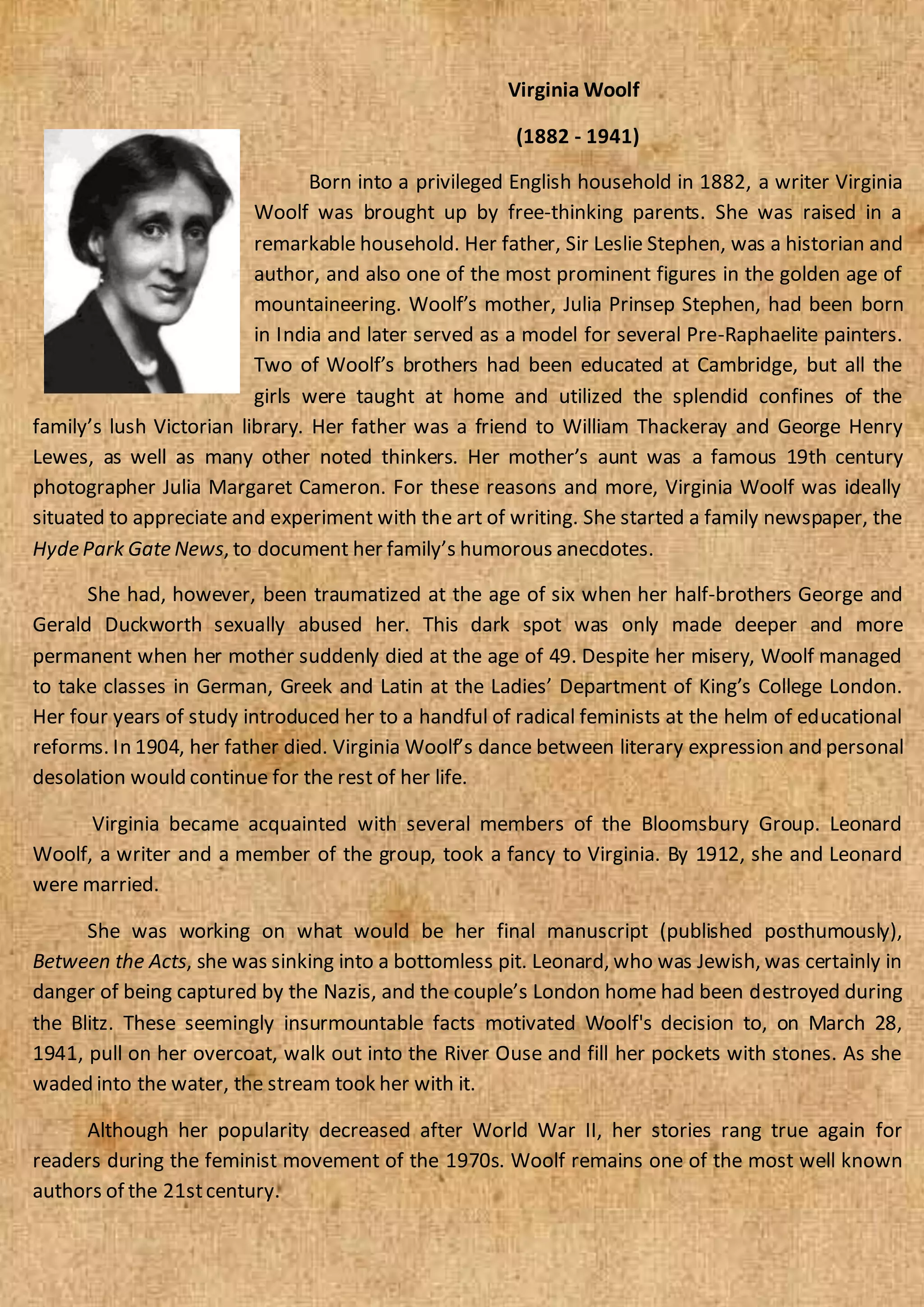 Virginia Woolf was born in 1882 into a privileged English household with remarkable parents - her father was a historian and her mother served as a model for Pre-Raphaelite painters. She was educated at home by her father and explored writing from a young age. However, she was also traumatized by sexual abuse as a child and her mother's early death. Woolf studied languages at King's College London and became acquainted with the Bloomsbury Group, marrying writer Leonard Woolf in 1912. Her life was marked by a struggle between literary expression and personal suffering, and in 1941 facing the destruction of her home in the Blitz and the danger her Jewish husband faced from Nazis, Woolf died by suicide in