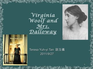 Virginia Woolf was a British writer and central figure of the Bloomsbury Group known for her modernist novels. She suffered several emotional traumas in her youth. Her most famous work, Mrs. Dalloway, explores a day in the life of Clarissa Dalloway and serves as a portrayal of 1920s British society after World War I through the use of stream of consciousness narrative. Woolf lived in several homes throughout her life, including in Richmond where she wrote Mrs. Dalloway.