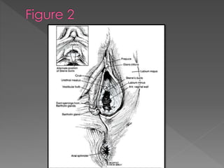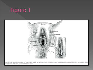 This document summarizes the female reproductive organs, including both external and internal structures. Externally, it describes the vulva and its components such as the labia majora, labia minora, clitoris, and vestibule. Internally, it outlines the vagina, uterus, and ovaries. It provides details on each structure's appearance, location, dimensions, and purpose within the reproductive system. The summary concludes by noting that the document categorizes and describes the key organs involved in human female reproduction.
