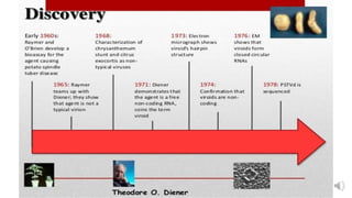This document discusses viroids, virusoids, and prions. It defines viroids as small, circular, single-stranded RNA molecules without a protein coat that can infect plants. Viroids were first reported in 1971 and the most studied is the Potato Spindle Tuber Viroid. Virusoids are also circular single-stranded RNAs that depend on plant viruses for replication and encapsidation. Prions are small infectious particles composed of abnormally folded protein that can transmit their misfolded shape to normal variants of the same protein.