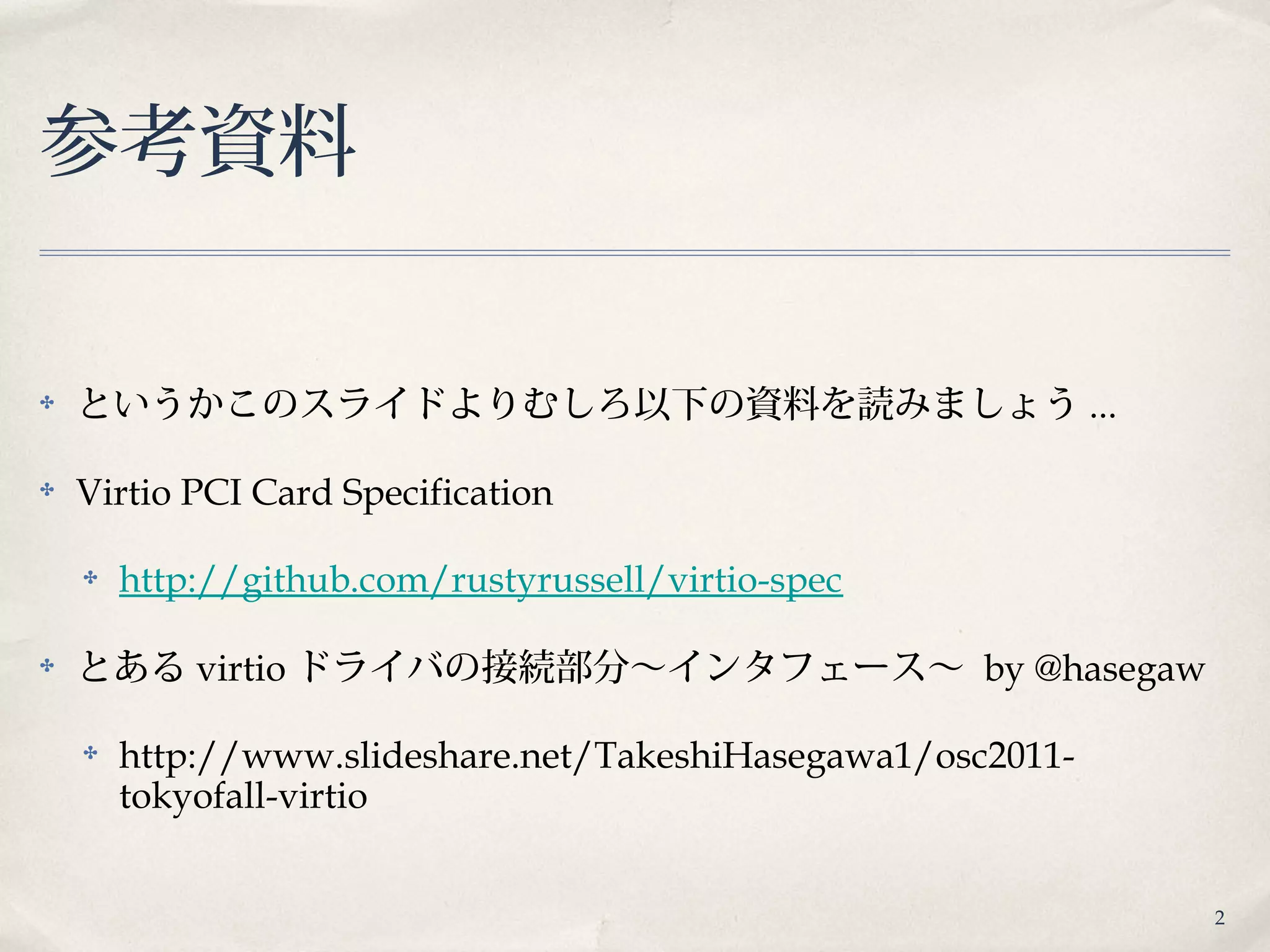 virtio勉強会 #1でしゃべった内容。 未完成版。pdfで上げたのが見えないので上げ直し。