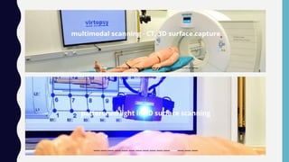 Virtopsy is a non-invasive virtual autopsy technique that uses medical imaging like 3D surface scanning, CT scanning, MRI, radiography and angiography to examine a corpse without dissection. It was developed as an alternative to traditional autopsy to avoid invasiveness. Virtopsy captures detailed internal images of tissues and bones within 10 minutes using these scanning techniques and reconstruction on computers. It allows for second opinions even after cremation since findings are in a digital format. The procedure involves placing a body in a scanning machine to generate thousands of cross-sectional images which are then reconstructed into a virtual 3D image of the interior. Virtopsy is being used to determine causes of death, identity, age and aid investigations