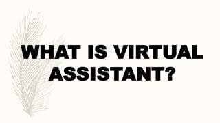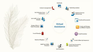 A virtual assistant is a self-employed professional who works remotely, typically from home, to provide administrative and technical support services to clients. They handle tasks like scheduling, email management, social media, research, and more. Some key advantages of hiring a virtual assistant are flexibility, the ability to work from anywhere, and gaining experience in different fields. However, virtual assistants also face disadvantages like lack of benefits, setting their own schedules around client needs, and distractions of working from home. Effective virtual assistants require skills like time management, customer service, communication, and a positive mindset.