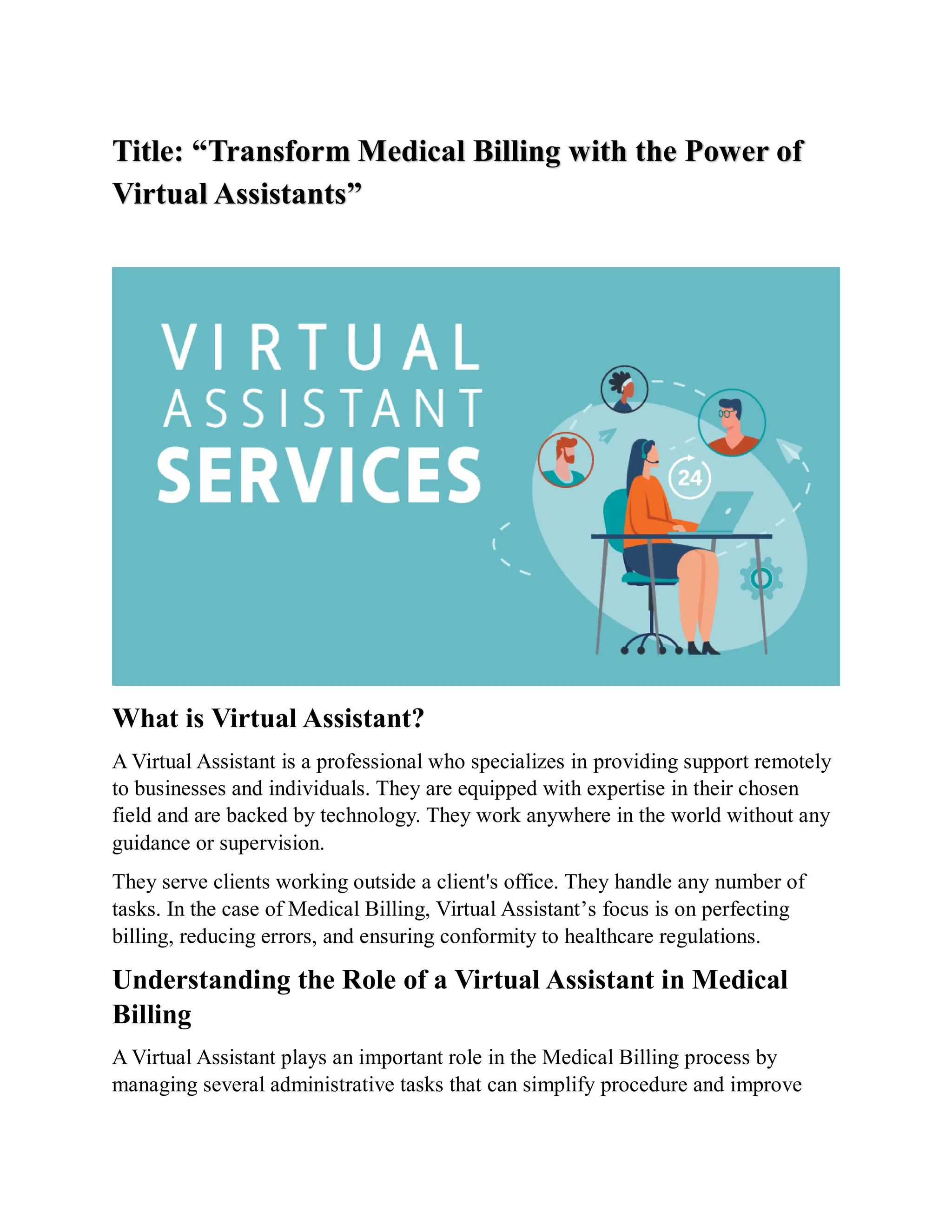 Virtual assistants (VAs) are critical in transforming medical billing by managing administrative tasks that enhance accuracy and efficiency, such as claims processing and patient communication. They provide cost-effective solutions, allowing healthcare providers to focus on patient care while maintaining compliance with healthcare regulations. The evolving role of VAs, aided by technology, promises even greater operational improvements in medical billing.
