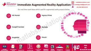 The document outlines various projects and applications related to virtual and augmented reality, including medical imaging, multimedia animations, and computer vision. It highlights tools and platforms used in these projects, such as Vuforia and OpenCV. Contact information for further inquiries is also provided.