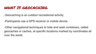 Geocaching is an outdoor activity where participants use GPS or other navigation to find hidden containers called geocaches located around the world. A virtual cache is similar but focuses on discovering a location rather than a physical container, requiring the participant to answer questions, take photos, or complete tasks related to the coordinates before logging their visit.