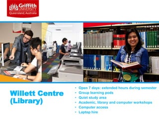 The document provides an overview of facilities and services available to students at the Willett Centre campus. It describes the student centre, library, sporting facilities, food outlets, and accommodation. The library has group study spaces, workshops, and computer/laptop access. Student services include careers support, counseling, medical care, and clubs for various interests. The campus offers lecture rooms, English language support, and transportation between campuses.