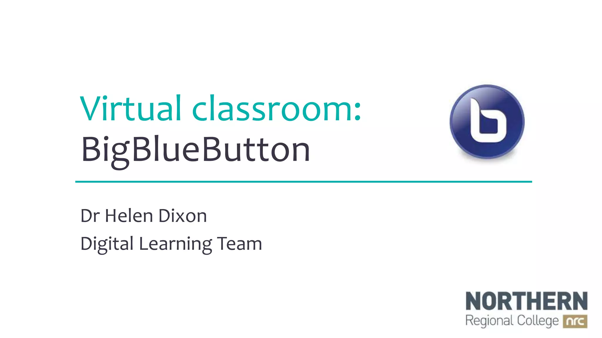 This document discusses using the virtual classroom tool BigBlueButton. It provides instructions for creating a BigBlueButton session in Moodle, joining a session, presenting content, polling participants, and using chat features. Some considerations for virtual classrooms are ensuring students have the necessary equipment and skills, clearly defining learning outcomes, and including interactive activities.