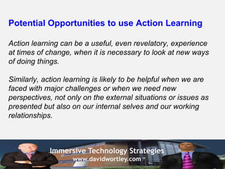 The document discusses using virtual collaboration technologies like teleconferencing, virtual classrooms, and virtual worlds to support action learning. Action learning can provide benefits when exploring work, self-awareness, and relationships. Virtual environments may encourage imagination and exploration while saving travel costs, but also present challenges around trust, common understanding, skills, and facilitation roles. More research is needed to fully understand the opportunities and challenges of applying immersive technologies to action learning.