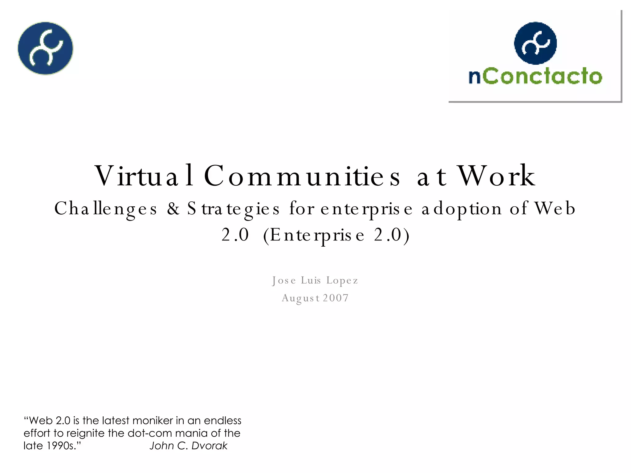 The document discusses the challenges and strategies for the adoption of Web 2.0 technologies in enterprise environments, highlighting the shift toward more complex and interconnected work practices. It outlines the key components of Enterprise 2.0, including user-generated content, collaboration, and the importance of a supportive organizational culture. Additionally, it emphasizes the role of social software in facilitating communication and collaboration among individuals within and across organizations.
