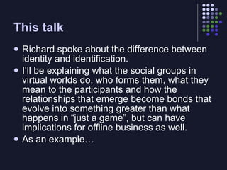 This document summarizes a talk on virtual communities. The talk discusses how social groups form in virtual worlds like Second Life, with members bonding over shared interests and identities. Virtual communities serve both game and social goals for their members. Successful communities establish norms, hierarchies, and reputation systems. The talk uses Second Life as a case study, describing communities there focused on issues like government, disabilities, and fundraising. Virtual communities operate similarly to real-world groups and can transfer relationships offline, while also providing opportunities for businesses to engage distributed audiences.