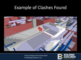 The document discusses Virtual Design and Construction (VDC) as a method for simulating the architecture and assembly of building projects, aiming to reduce risks, improve efficiency, and control costs. It outlines the advantages of using VDC such as enhanced project planning, clash resolution, and accurate quantity take-offs, along with case studies demonstrating its effectiveness. The adoption of VDC and Building Information Modeling (BIM) is highlighted across various sectors, emphasizing a shift towards more transparent and efficient processes in construction.