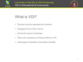 The document discusses the implementation of Virtual Desktop Infrastructure (VDI) in educational environments, specifically at the University of Sevilla. It highlights the benefits of VDI, such as cost savings, increased accessibility, and improved user experience, along with the details of the OpenLabs project initiated in the 2010/2011 academic year. The document also emphasizes the advantages of UDS Enterprise, including its compatibility and expertise in educational settings.