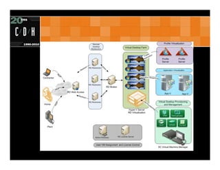 The document provides an overview of virtual desktop infrastructure (VDI), highlighting its benefits such as cost-effectiveness, improved security, and centralized administration, as well as drawbacks like the need for significant initial investment and reliance on network connectivity. It includes a comparison of key players in the market, including Microsoft, Citrix, and VMware, detailing their offerings and features. The conclusion poses essential questions for organizations to consider in deciding whether VDI is the right solution for them.