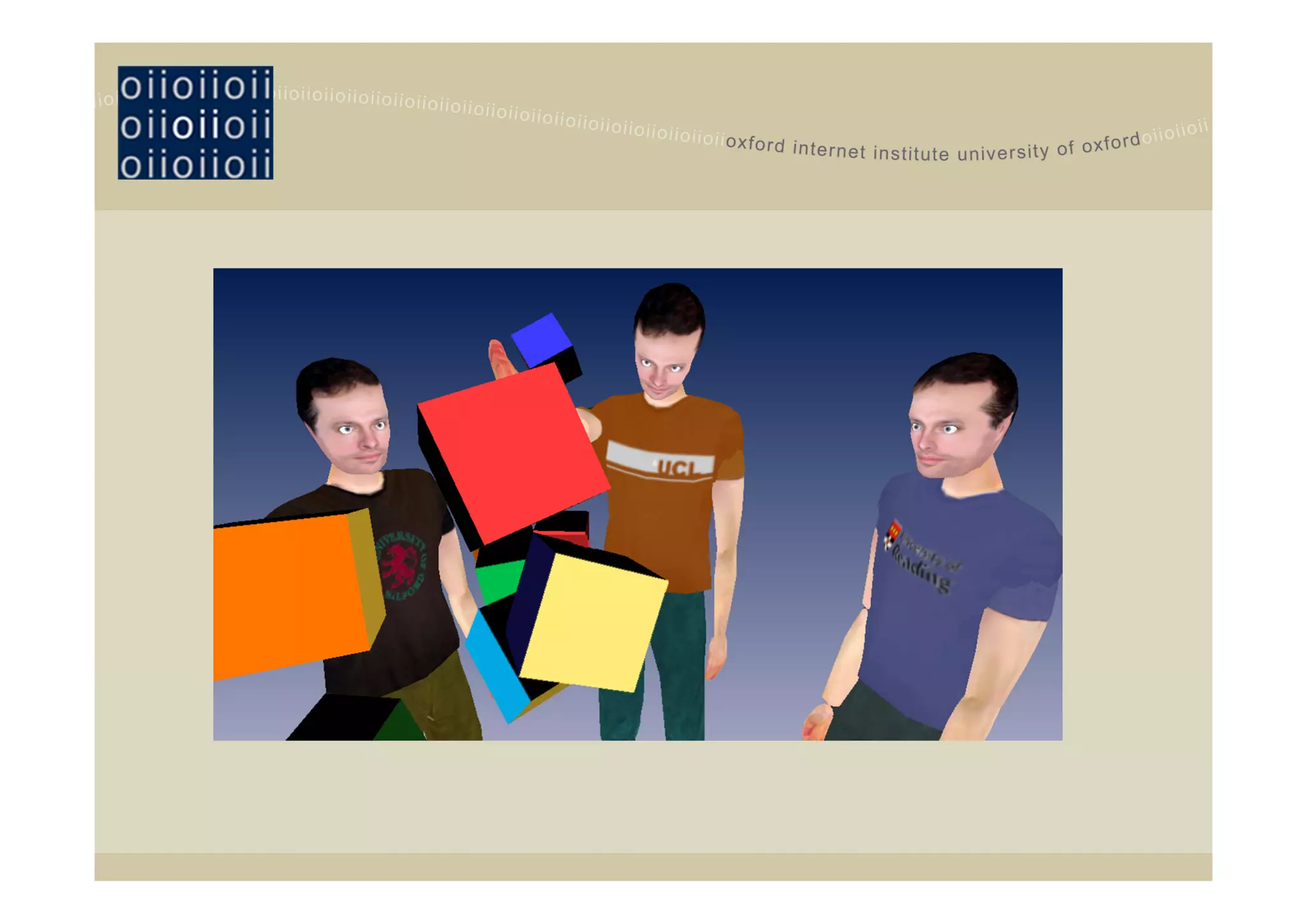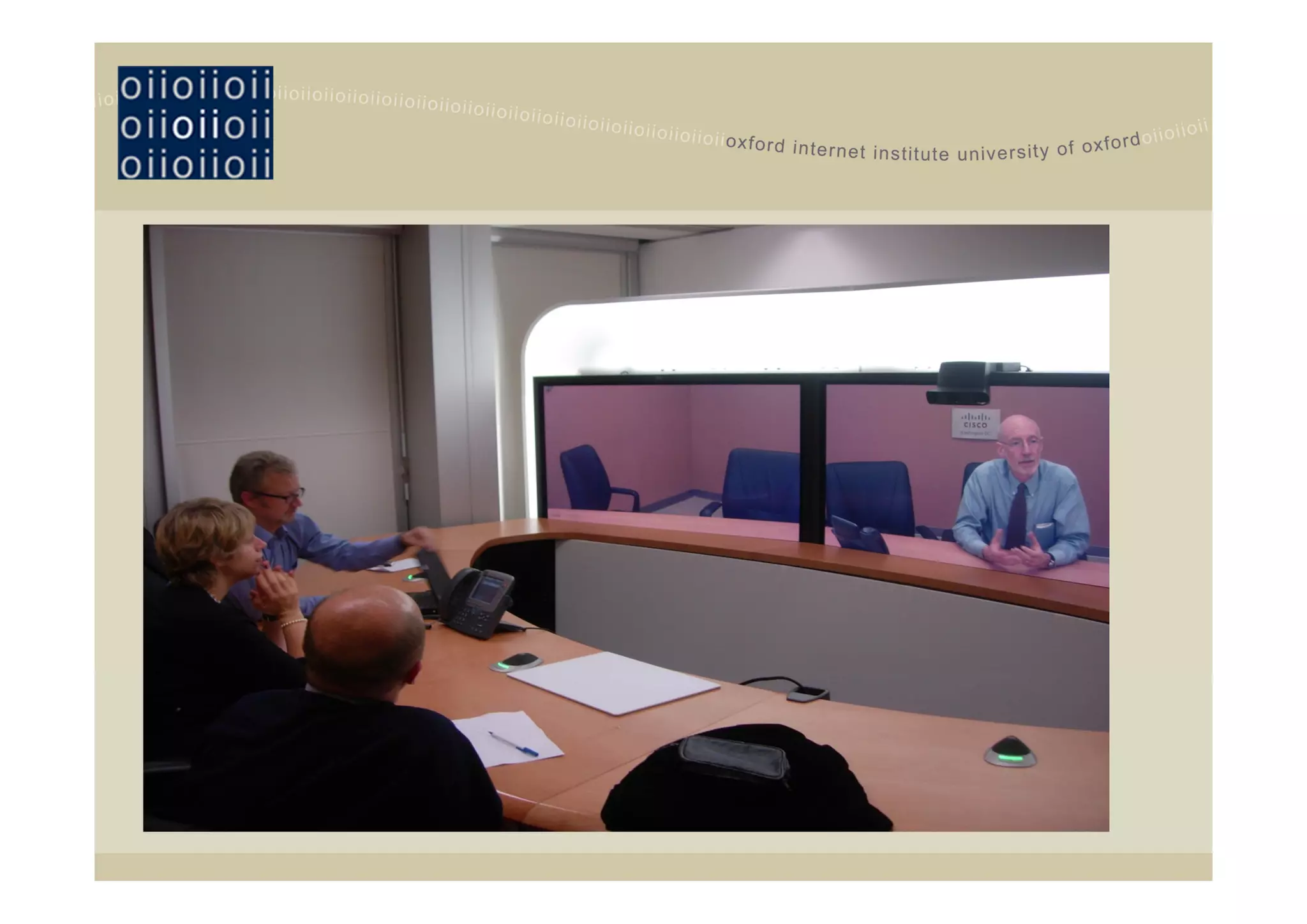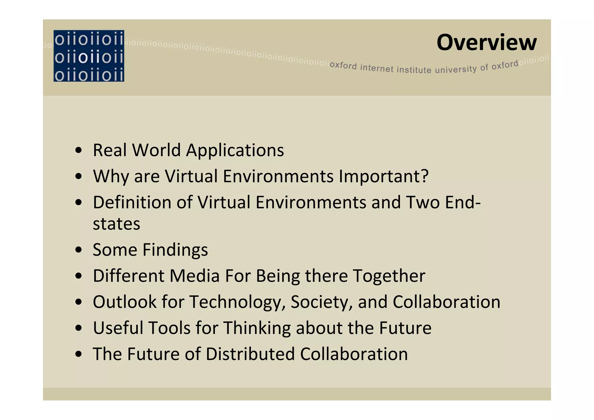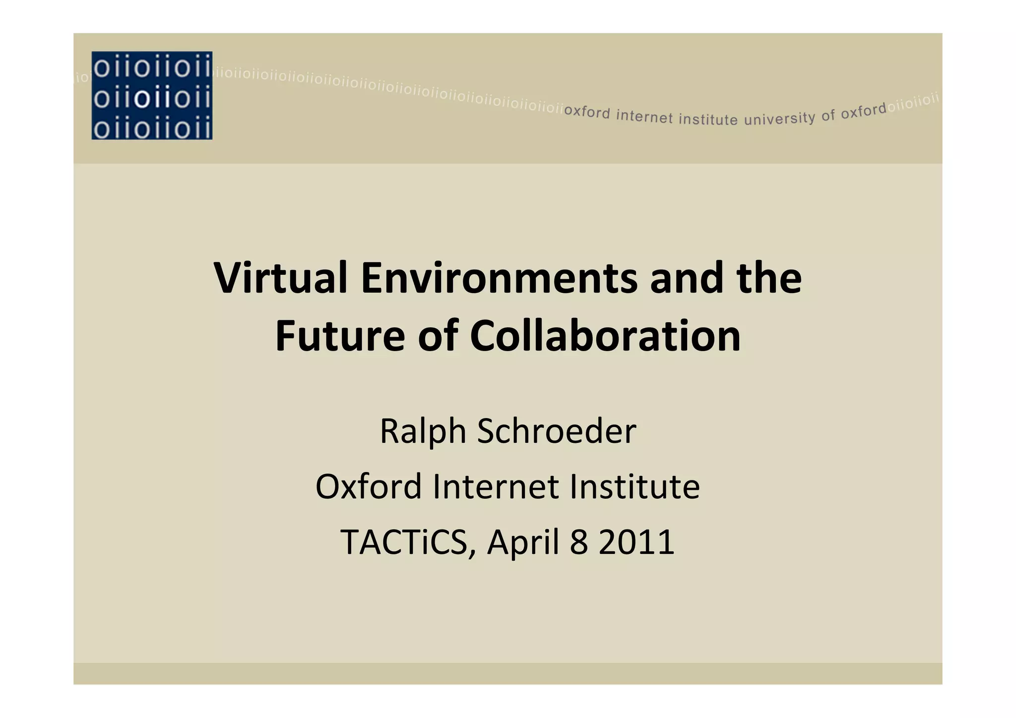 Virtual environments will be important for future collaboration. There are two end states of virtual environments - totally immersive video or computer-generated environments. Research has found that collaboration can be as good in virtual environments as in-person, and that more immersive environments lead to a stronger sense of togetherness. The technology is advancing to make large, realistic 3D displays cheaper. In the future, collaboration will involve effectively mixing video, virtual environments, augmented reality and other modalities to support different tasks.