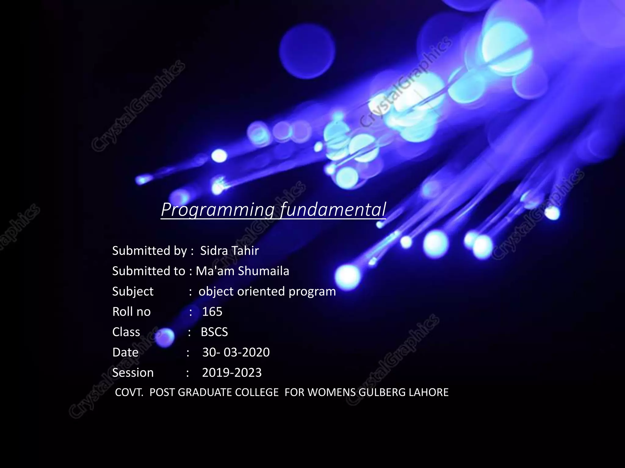 This document provides an overview of object-oriented programming concepts in C++ including polymorphism, virtual functions, pure virtual functions, abstract classes, and pointers to objects. It defines each concept, provides syntax examples, and short programs to demonstrate how each concept works in practice. The document is submitted as part of a programming fundamentals course by Sidra Tahir to her instructor at COVT Post Graduate College for Women in Lahore, Pakistan.