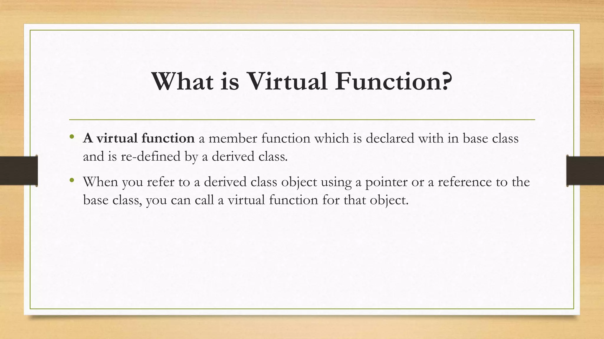 A virtual function is a member function declared in a base class and re-defined in a derived class, enabling polymorphism when accessed via base class pointers or references. They allow the correct function to be called at runtime, with the declaration requiring the 'virtual' keyword and adherence to specific rules such as not being static. The document also explains early binding (compile-time) and late binding (runtime) in relation to virtual functions.