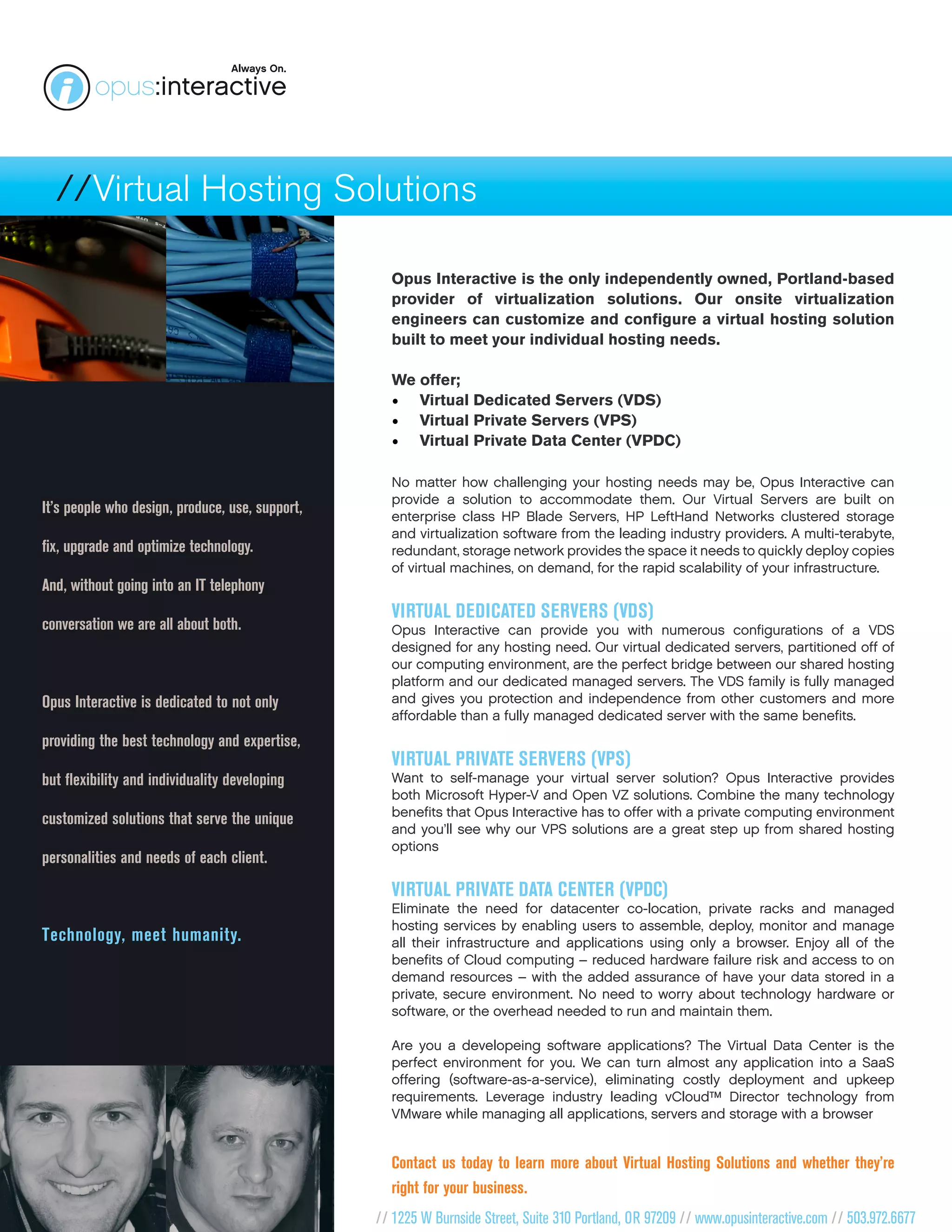 Opus Interactive is an independently owned provider of virtualization solutions based in Portland, offering services like virtual dedicated servers (VDS), virtual private servers (VPS), and virtual private data centers (VPDC). Their infrastructure utilizes enterprise-class technology to deliver tailored, managed hosting solutions, catering to various client needs. Founded in 1994, Opus Interactive helps organizations reduce IT costs and improve efficiency with advanced, energy-efficient hosting options.