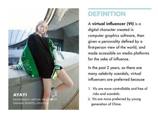 This document provides an overview of virtual influencers in China. It defines virtual influencers as digital characters created through computer graphics that are given personalities and used on media platforms for their influence. Virtual influencers are becoming more popular in China as they are seen as more controllable and appealing to younger generations compared to real celebrities. The document then categorizes various types of virtual influencers in China, including branded influencers owned by companies to promote their brands, independent influencers working as singers or in gaming/lifestyle, and examples of popular individual influencers. It concludes that the virtual influencer market in China is estimated to grow significantly in the next 10 years.