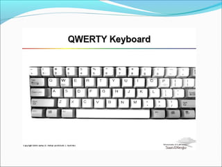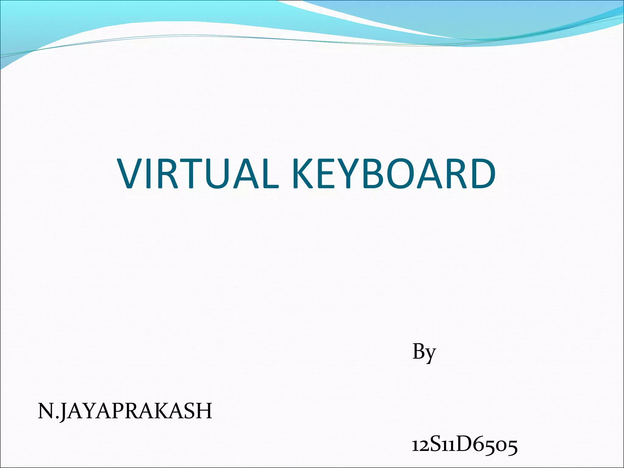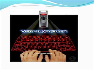 The document discusses virtual keyboards, which use laser and sensor technology to project a keyboard interface onto any surface. A virtual keyboard consists of a sensor module to track finger movements, an infrared light source to project the keyboard image, and a pattern projector to display the standard QWERTY keyboard layout. Virtual keyboards offer portability by allowing users to type on any flat surface, but lack the tactile feedback of a physical keyboard.