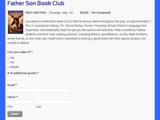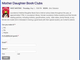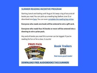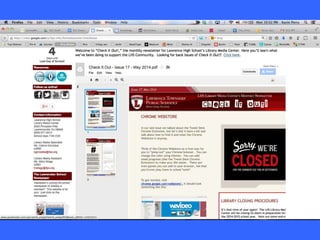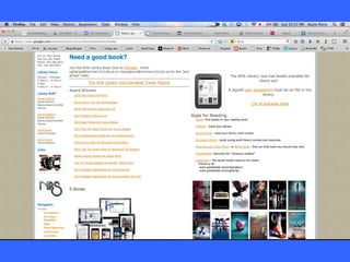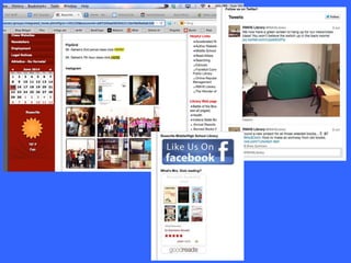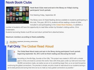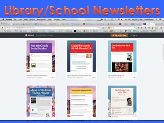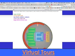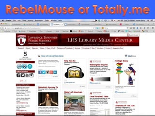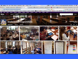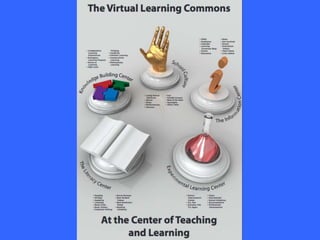 This document discusses the concept of a Virtual Learning Commons (VLC), which aims to transform a traditional library website into an online participatory community. It provides examples of different components a VLC could include, such as an Information Center with useful tools and links, a Literacy Center for reading and writing resources, and a Knowledge Building Center for sharing project work and collaborating. The document emphasizes fostering stakeholder participation and collaboration to support learning both in and out of the classroom through a VLC. It also shares examples of existing VLC implementations and platforms that can be used to create a VLC.