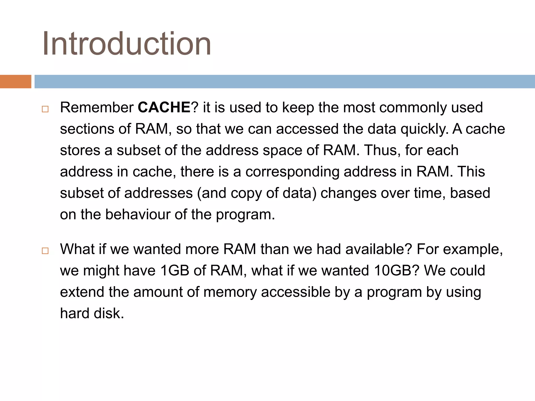 Virtual memory uses the hard disk as additional memory by moving rarely used data between RAM and the paging file on disk. When RAM is full, unused data is written to the paging file to free up space in RAM. A page table maps virtual memory page numbers to physical locations in RAM or the paging file. This allows programs to access more memory than the available RAM by transparently storing data on disk when needed.