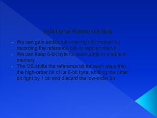 Virtual memory allows processes to execute using both physical RAM and disk storage. When a process references a page not in RAM, demand paging brings that page into a free frame from disk. Page replacement completes the separation of logical and physical memory, allowing a larger virtual memory in a smaller physical RAM. Common page replacement algorithms include FIFO, LRU, and LFU.