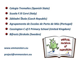 This document lists the names and locations of 6 schools and 1 preschool from across Europe that are participating in a project called "VM Monsters" along with the website and email contact for the project. The schools listed are from Spain, Italy, Czech Republic, Portugal, United Kingdom, and Sweden.